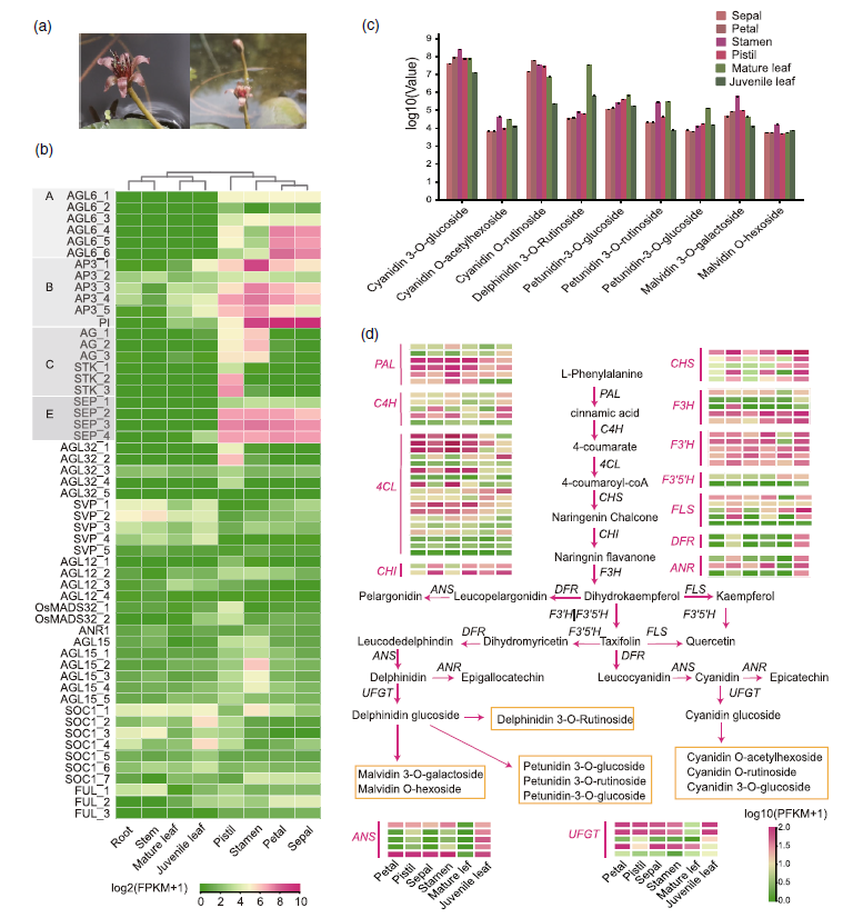 · 花部同源演化: 针对莼菜花器官(萼片、花瓣、雄蕊、雌蕊)颜色均一的特征,研究发现花青素合成基因(如CHS、DFR)及MADS-box基因在各器官中均维持高表达。这一结果支持了“花部同源演化”假说,证明莼菜保留了早期被子植物花器官分化前的原始状态。